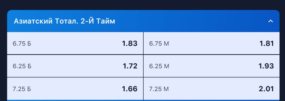Азиатский гандикап может быть целым (например, -1, -2), дробным (-1.5, -2.5) или состоять из двух значений (-1, -1.5). В случае с двумя значениями половина ставки делается на каждое значение гандикапа.