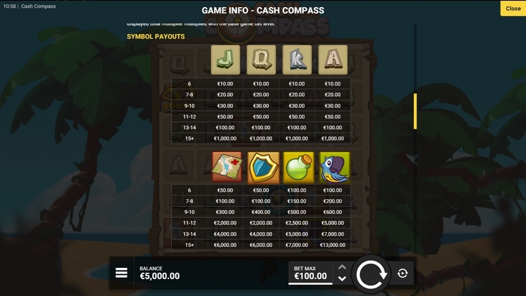 | J, Q, K, A | 10 | 20 | 30 | 50 | 100 | 1 000 | - | - | - |