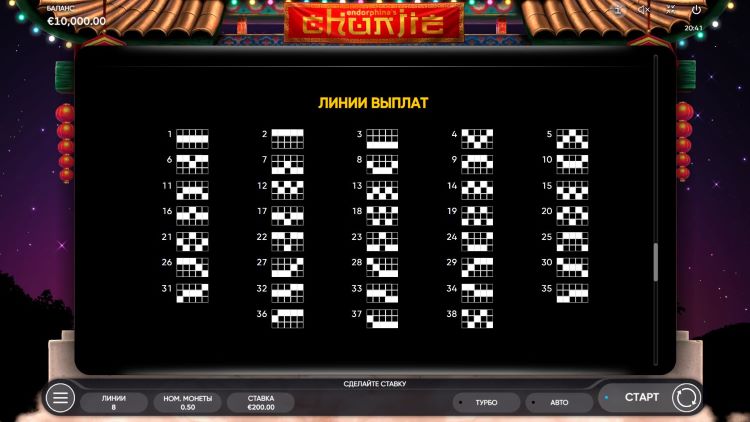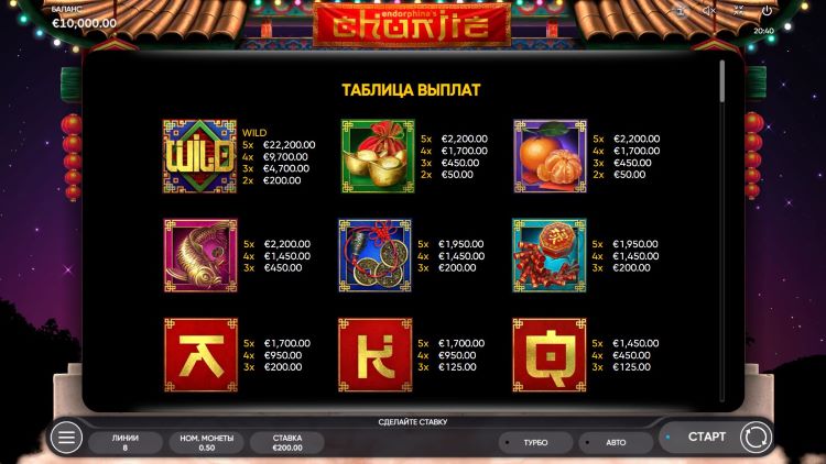 | Китайский дракон (Scatter) | 200 | 400 | 1600 | 37 600 |