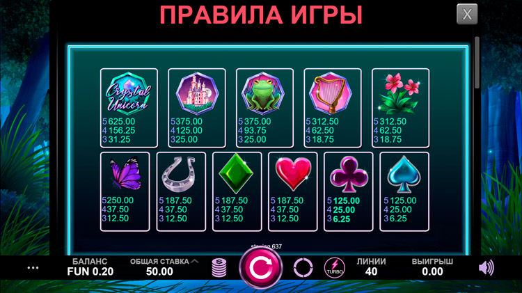 Таблица выплат Crystal Unicorn