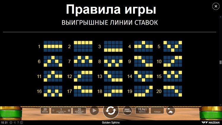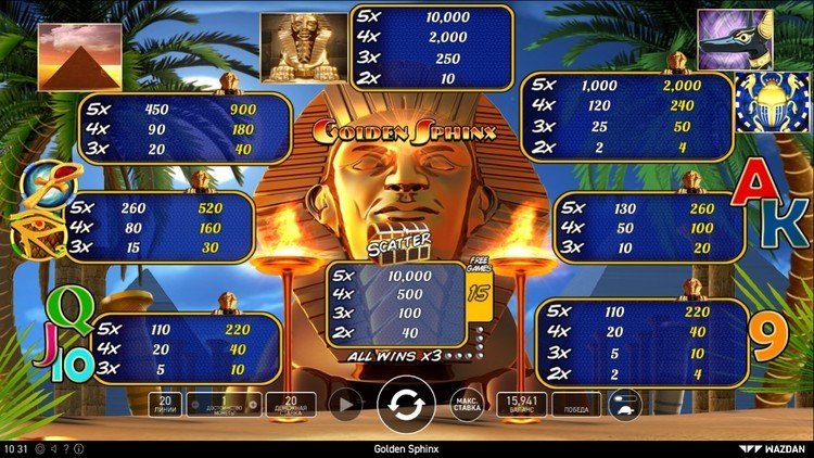 | Золотой Сфинкс (Wild) | 10 | 250 | 2000 | 10 000 |