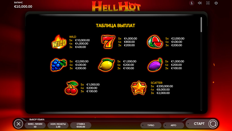 | Огонь (Wild) | 400 | 4 000 | 10 000 |