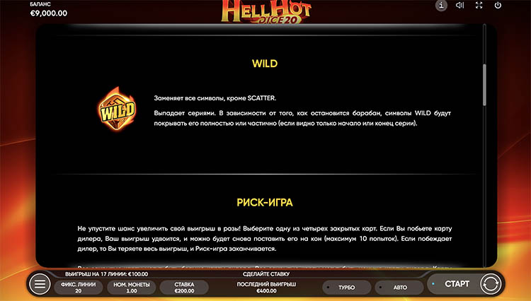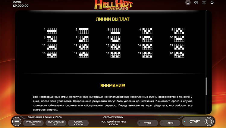 Таблица выплат Hell Hot Dice 20