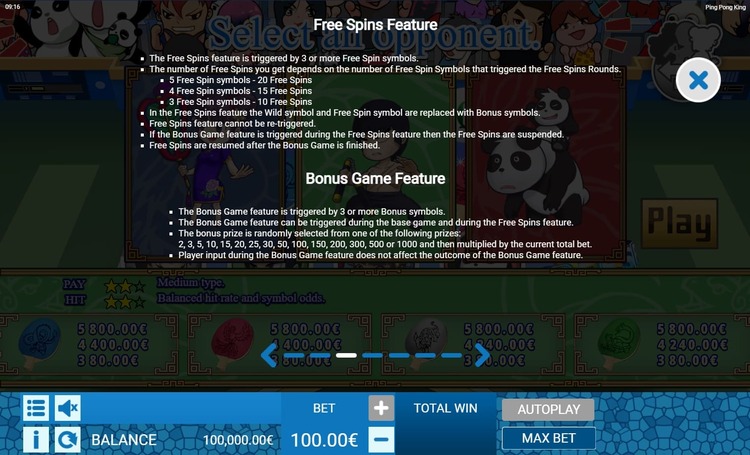 Таблица выплат Ping Pong King