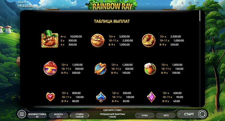 Таблица выплат Rainbow Ray