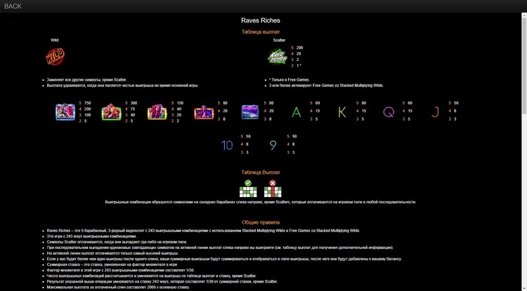 Таблица выплат Rave Riches