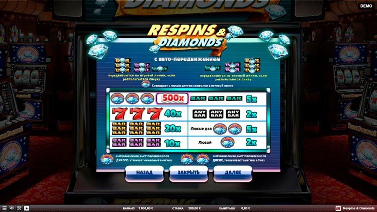 Таблица выплат Respins and Diamonds