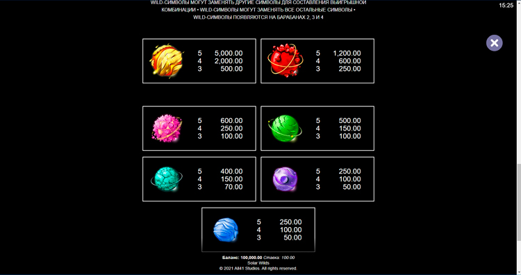 Таблица выплат Solar Wilds
