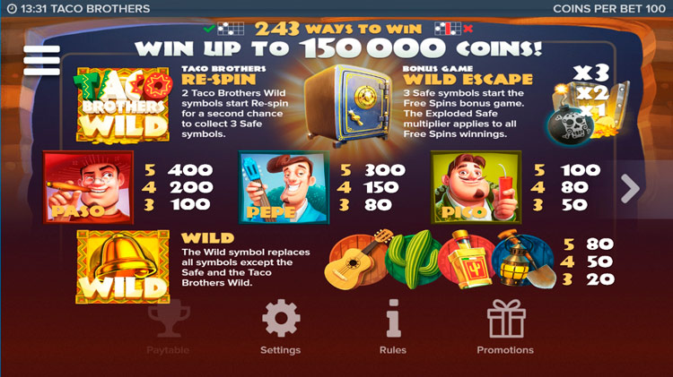Таблица выплат Taco Brothers