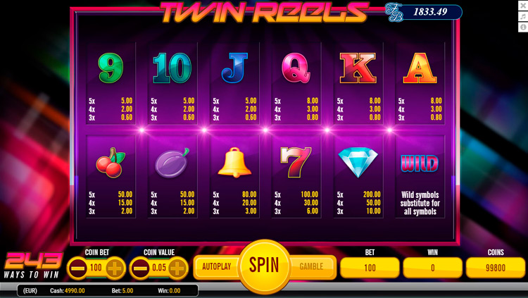 Таблица выплат Twin Reels