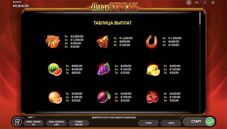 Таблица выплат Wild Streak