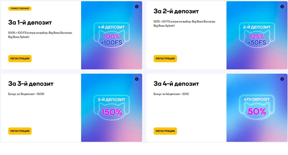 Игровая онлайн-платформа Cat Casino предлагает щедрый и достойный внимания приветственный бонус для новых пользователей. Всех без исключения. А еще интереснее то, что этот бонус предлагает впечатляющую 325-процентную прибавку к вашему депозиту, а также дополнительные 150 бесплатных вращений. Это невероятно щедрое предложение не может не увлечь и не взволновать тех, кто ищет захватывающий и насыщенный игровой опыт, а также рассчитывать на получение выигрыша.