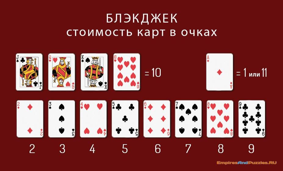 В игре блэкджек карты имеют следующие номиналы, которые определяют их ценность в очках: