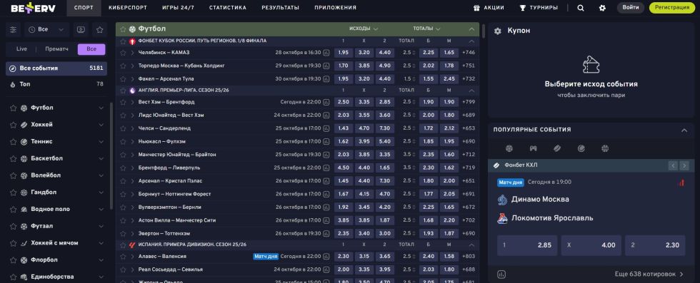 Коэффициенты у Bettery конкурентные: средняя маржа находится в пределах 4–6 %, а на топ-матчи — ещё ниже.