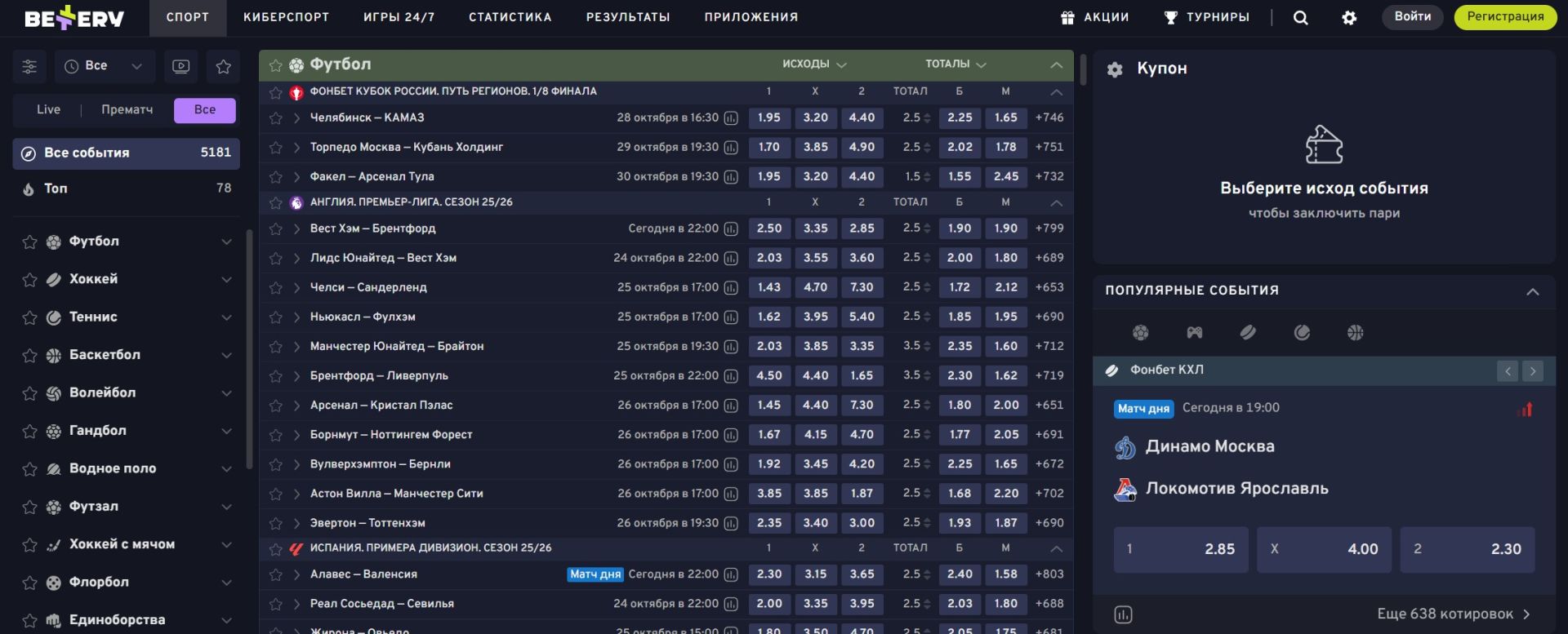 Доступны популярные направления: футбол, хоккей, теннис, баскетбол, волейбол, бокс, киберспорт и даже настольный теннис.