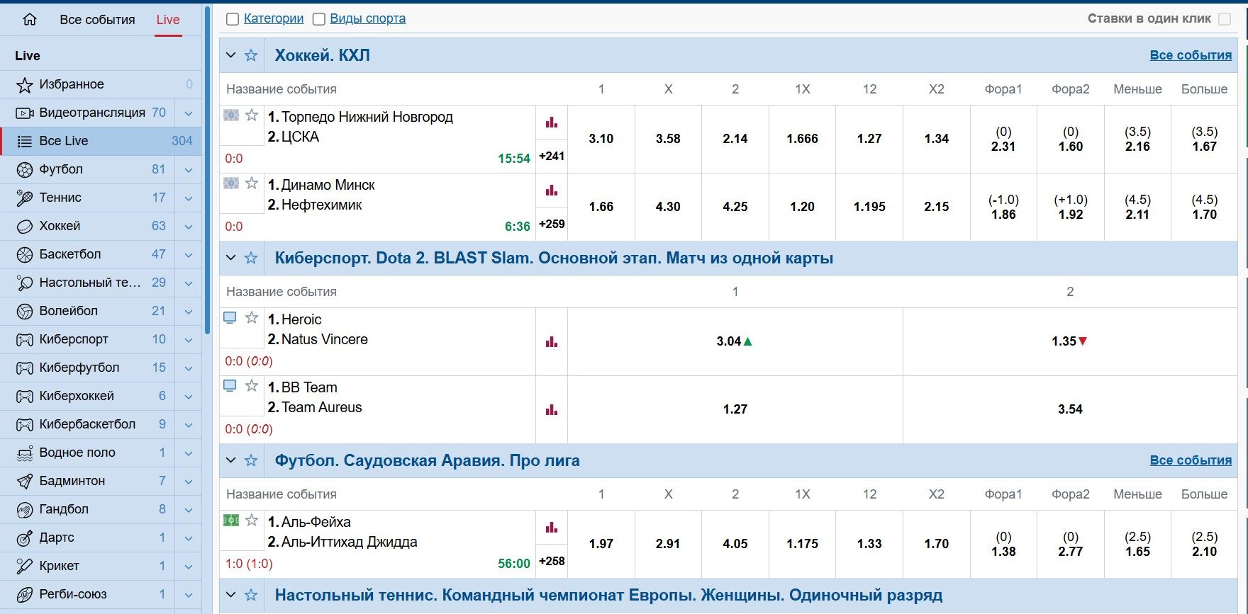 Хоккей — второе по популярности направление для ставок. Континентальная хоккейная лига (КХЛ) и Национальная хоккейная лига (НХЛ) имеют глубокую роспись с возможностью ставок на каждый период, индивидуальные тоталы, дополнительные форы и специальные исходы. Платформа предлагает уникальный рынок «как завершится матч» — в основное время, овертайме или по буллитам.