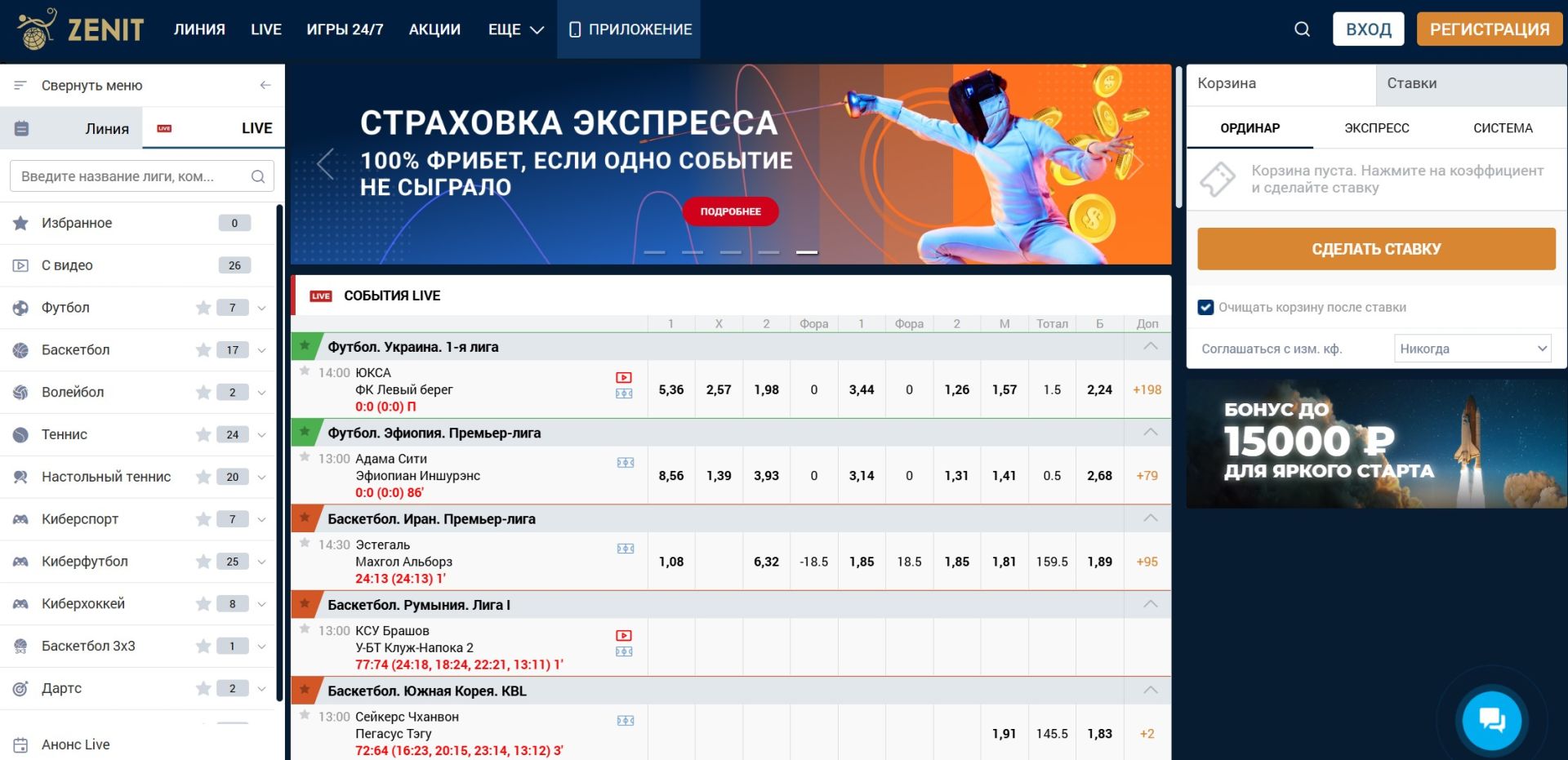 - 🎁 Бонус за регистрацию до 15 000 ₽ — для новых пользователей, прошедших регистрацию и первую ставку.