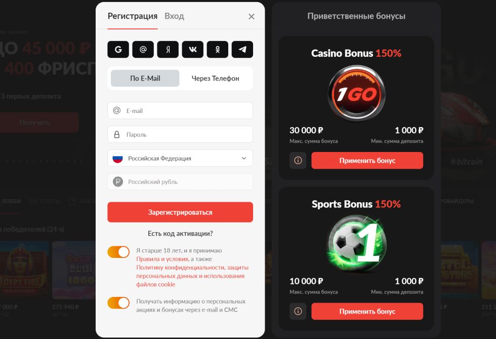 1GO Casino предлагает простую и быструю регистрацию, благодаря которой вы сможете мгновенно начать играть в свои любимые азартные игры. Наша платформа обеспечивает несколько удобных способов создания учетной записи, позволяя каждому игроку выбрать наиболее подходящий для себя метод.