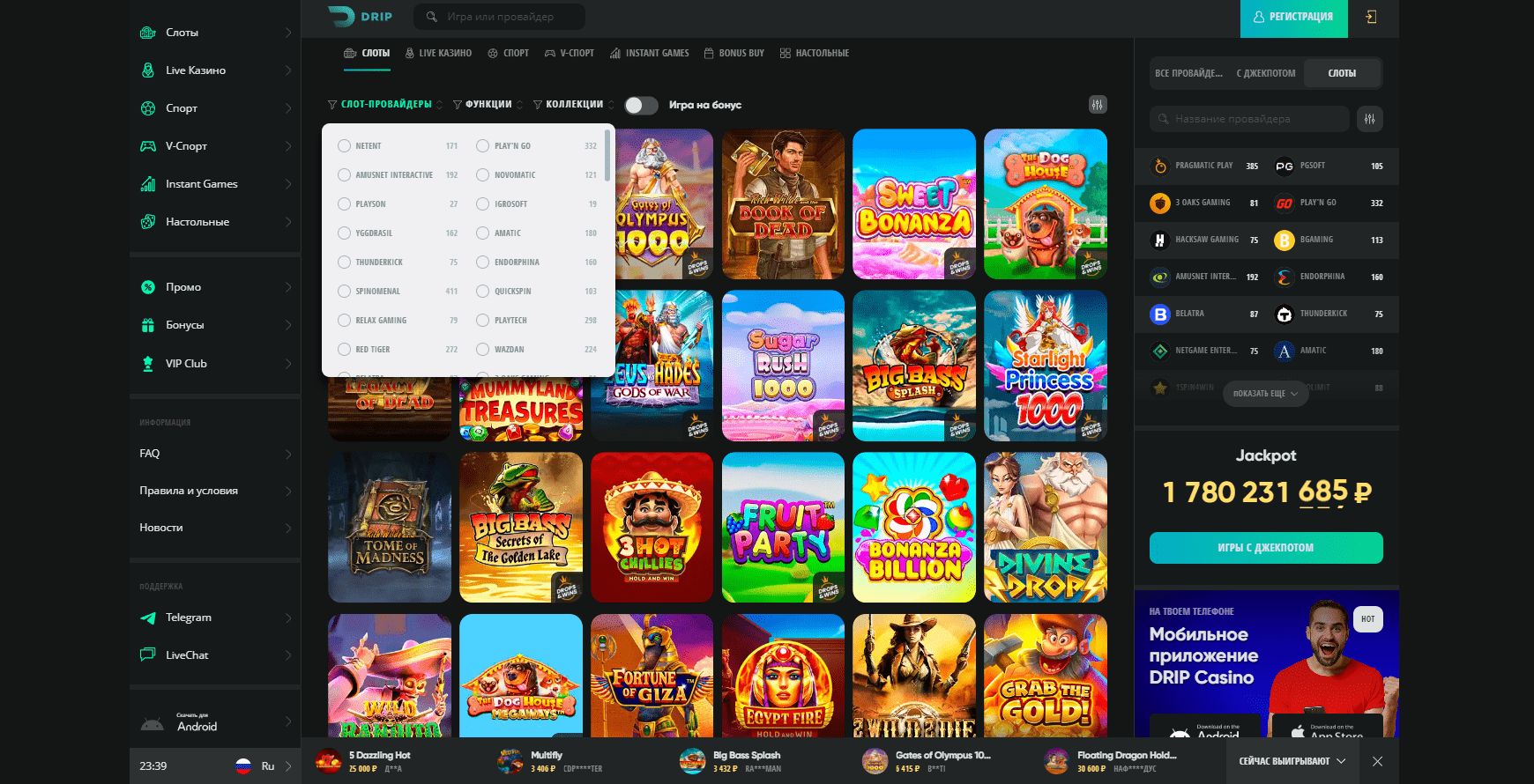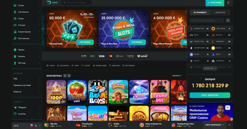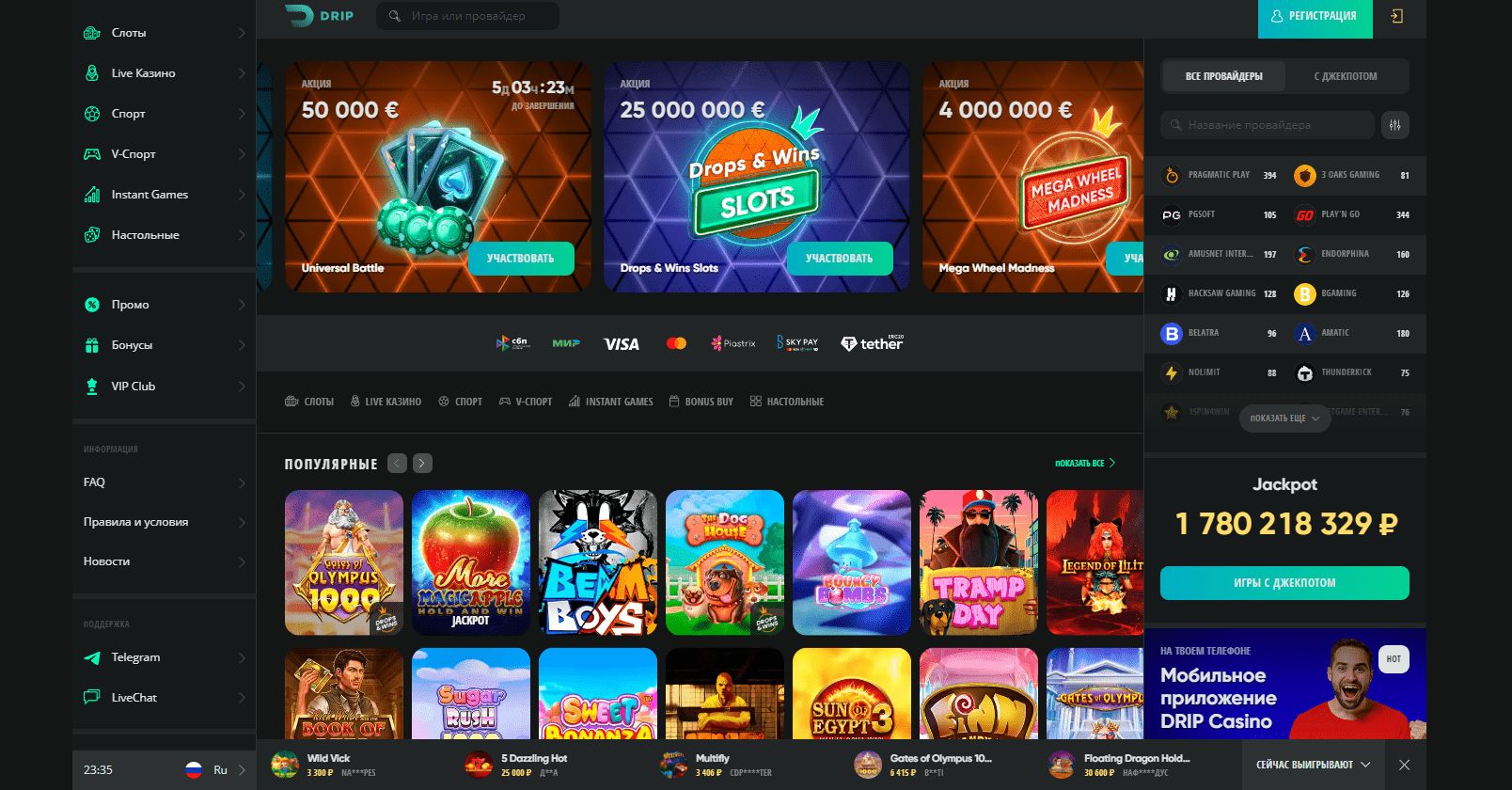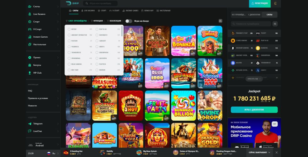 Drip Casino предлагает широкий ассортимент слотов на любой вкус. Игроки могут выбирать из различных категорий: