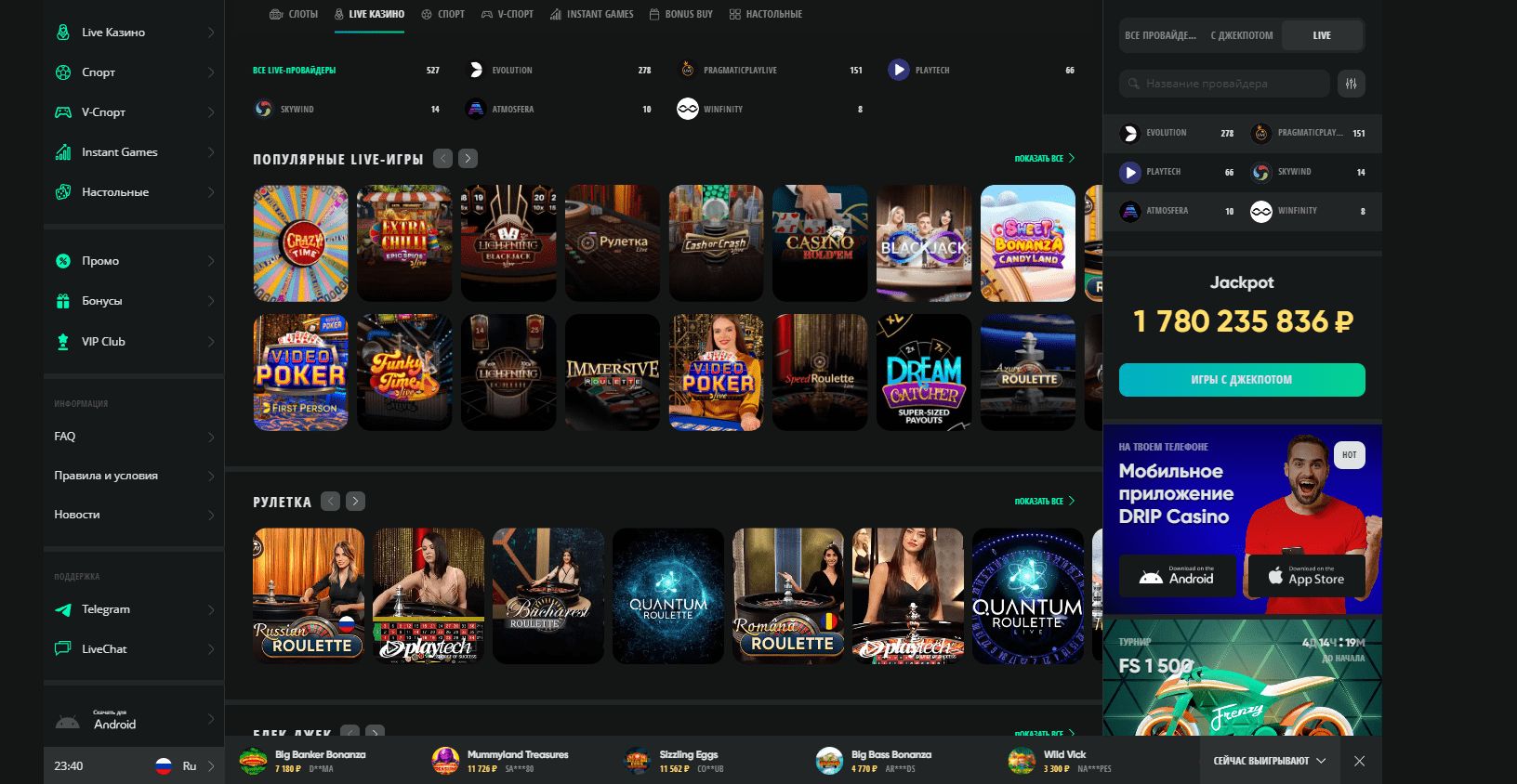 Drip Casino предлагает захватывающие игры с живыми дилерами, которые создают атмосферу настоящего казино.