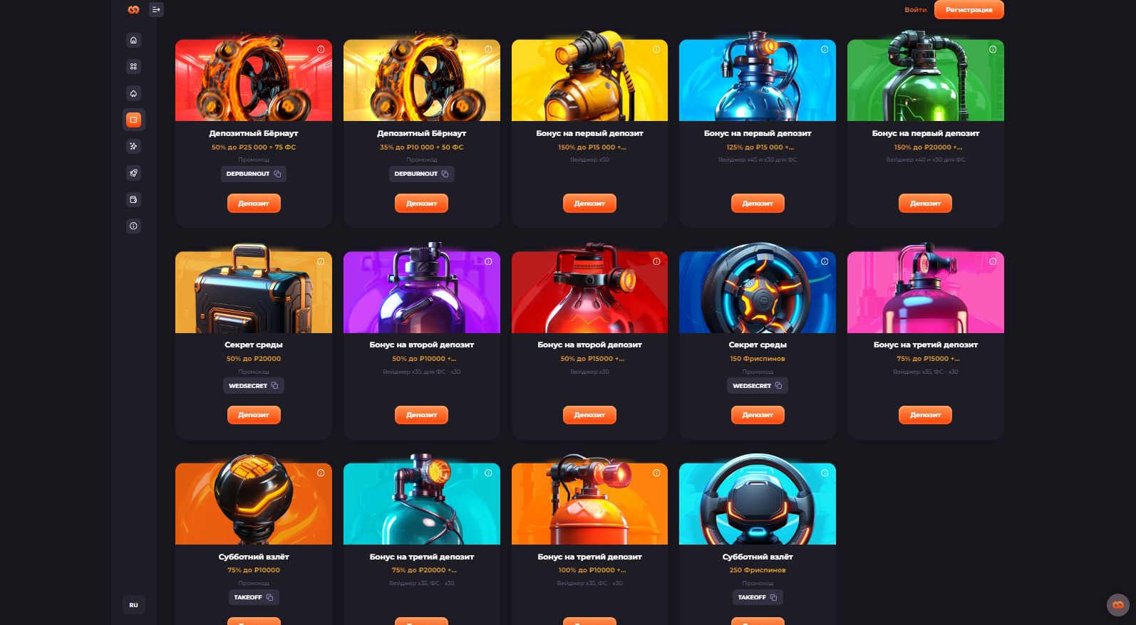 Платформа продумала варианты приветственных бонусов для разных категорий игроков, под разные депозиты, с разным балансом ФС и бонусов на депозит.